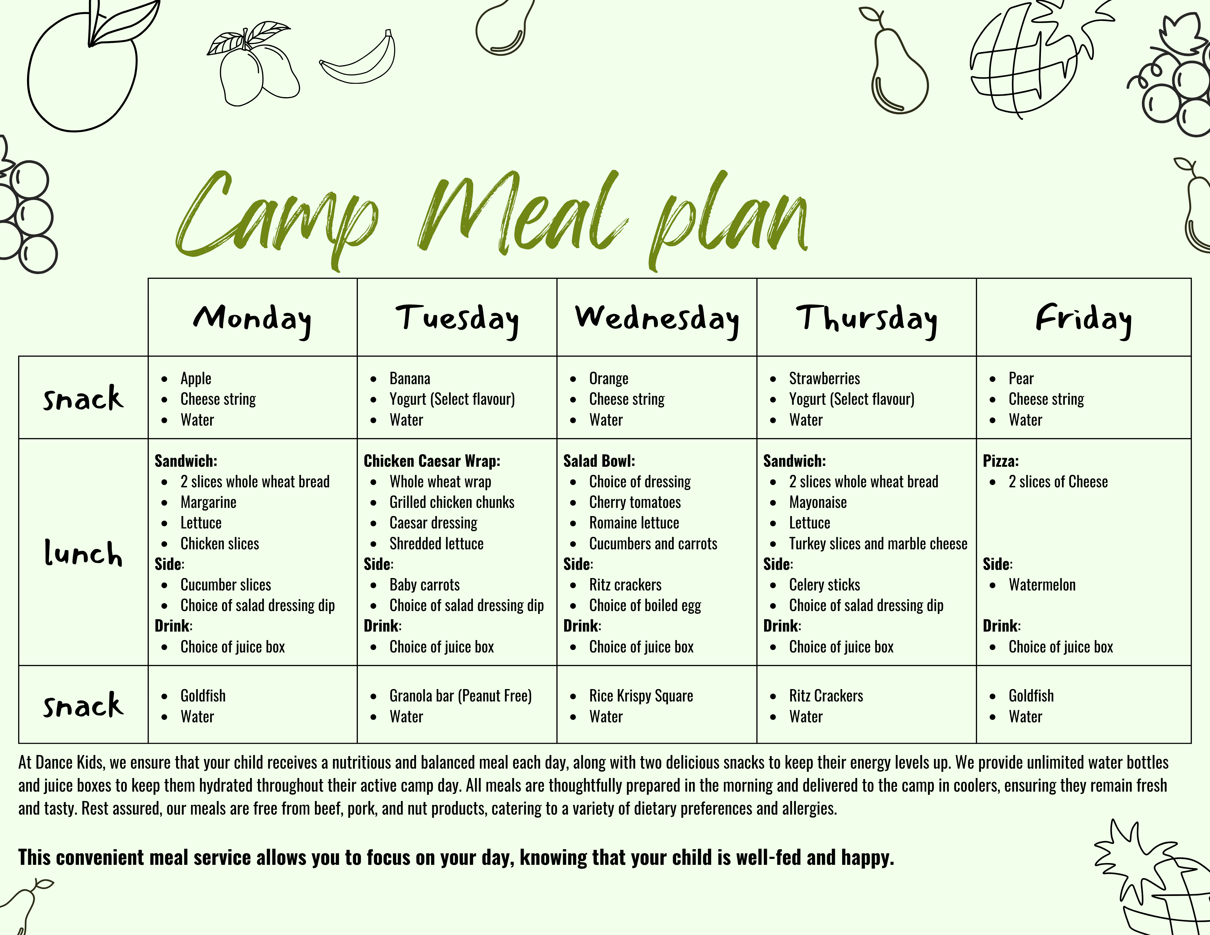 The meal program includes lunches, snacks, and a refillable water bottle, all prepared in advanced for your child.